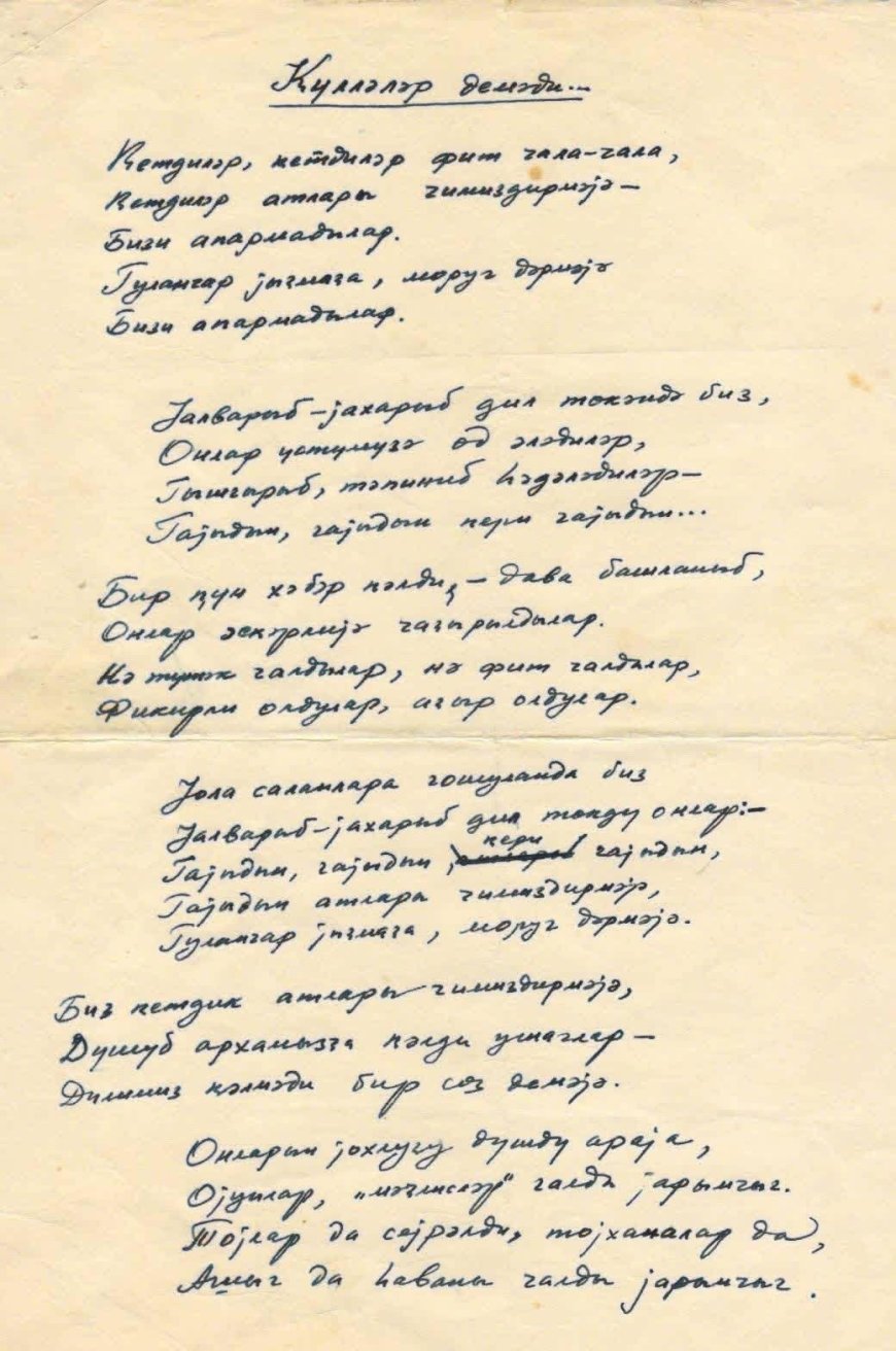 Rubrikada yazıçı, tərcüməçi Nəriman Əbdülrəhmanlının təqdimatında tanınmış imzaların şeirləri ilkin əlyazma formasında oxuculara təqdim olunacaq. Rubrikanın ilk qonağı unudulmaz şair İsa İsmayılzadədir. Onun məşhur "Güllələr demədi" şeirini təqdim edirik.